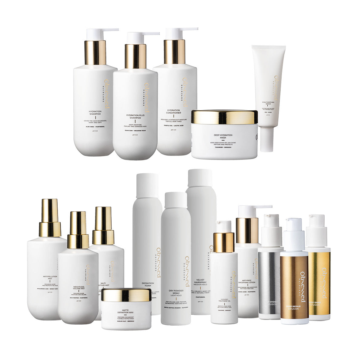 Kaikki sarjan hoitotuotteet sisältävät ainutlaatuisen 3Activ Complex -yhdisteen, jossa vaikuttavina ainesosina ovat mm. shiitake-sieni, vihreä kaviaari ja valkoinen tryffeli. Kaikki Obsessed Haircare -sarjan hoitotuotteet tarjoavat lisäksi optimaalista suojaa hiuksille, sillä ne sisältävät ainutlaatuisen yhdistelmän tarapuusta saatavia tanniineja ja auringonkukanversojen uutetta.