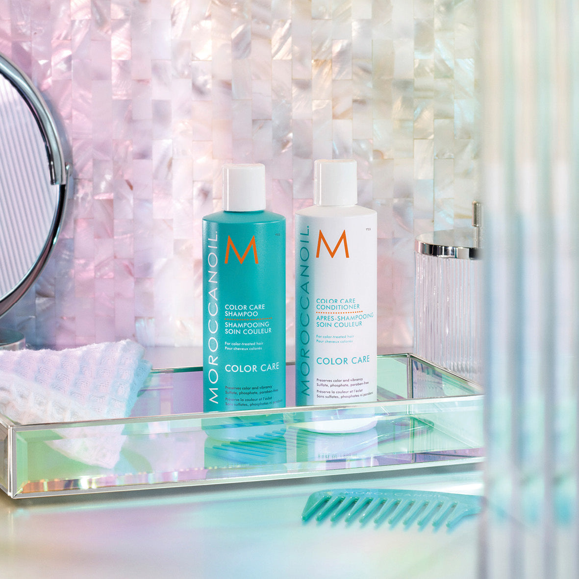 Uutuus! Värikäsitellyille hiuksille tarkoitetut Moroccanoil Color Care-tuotteet pidentävät hiusvärin ikää, samalla kun ne parantavat hiusten eheyttä ja antavat hehkuvaa kiiltoa. pH-tasapainotettu shampoo puhdistaa hellävaraisesti ja suojaa väriä haalistumiselta, auringolta sekä ympäristön saasteilta. Erittäin kosteuttava hoitoaine suojaa, pehmentää ja selvittää, tehden hiuksista helpommin hallittavat ja terveen näköiset.